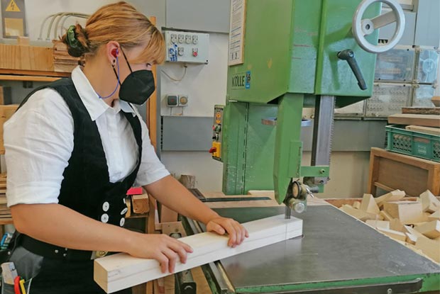 Mit der Bandsäge schneidet die angehende Zimmerin Selina Möbius ein Kerbeneck aus.