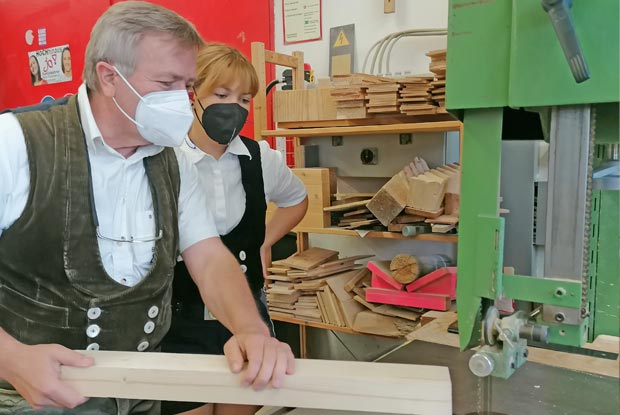 Wie man ein Kantholz fachgerecht zuschneidet, zeigt hier Ausbilder Wolfgang Weigl.