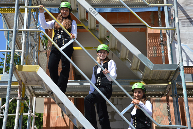 Bereit für die Baustelle: Die drei Cousinen auf dem Weg zum Dachfirst.