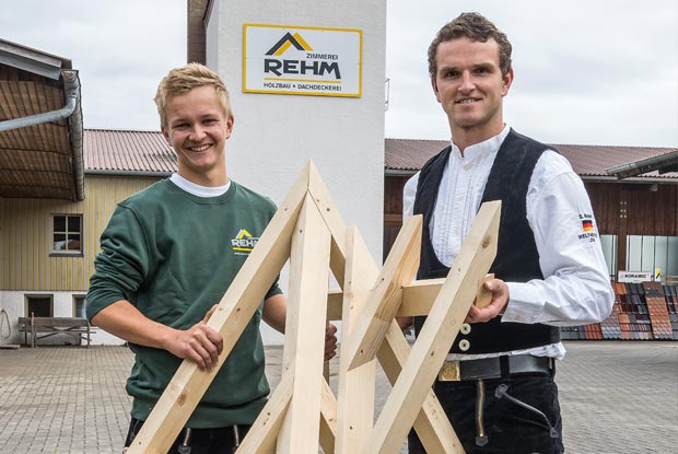 Gibt sein Wissen gerne weiter: Simon Rehm (r.) hat Bayerns besten Nachwuchs-Zimmerer 2020 Niklas Grad ausgebildet. Außerdem ist Rehm zweiter stellvertretender Teamleiter der Zimmerer-Nationalmannschaft.
