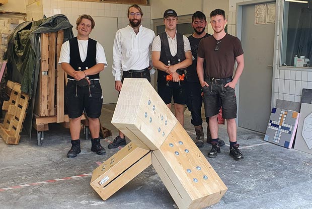 Sehr stolz waren die Azubis der ÜBA München, als sie ihre Holzverbindung im Großformat in den Räumen der Galerie Handwerk in München ablieferten. Dort ist das Bauteil in der Ausstellung „Formen traditionellen Handwerks in Bayern und ihre Weiterentwicklung“ noch bis zum 9. Oktober zu sehen.