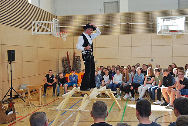Bereits im dritten Jahr in Folge hat Zimmermeister Richard Betz sein Ein-Mann-Theaterstück „Mit Herz und Hand“ an bayerischen Schulen aufgeführt. 2018 sahen ihn dabei an 28 Mittel- und Realschulen fast 4000 Schüler.
