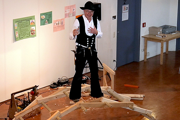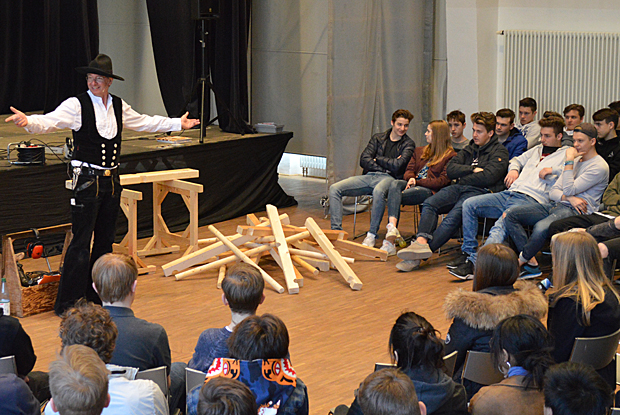 "Jetzt weiß ich erst, was im Holzbau möglich ist." Beeindruckt reagieren Schüler auf das Ein-Mann-Theater-Stück von Zimmermeister Richard Betz, das er an bayerischen Mittel- und Realschulen aufführt.